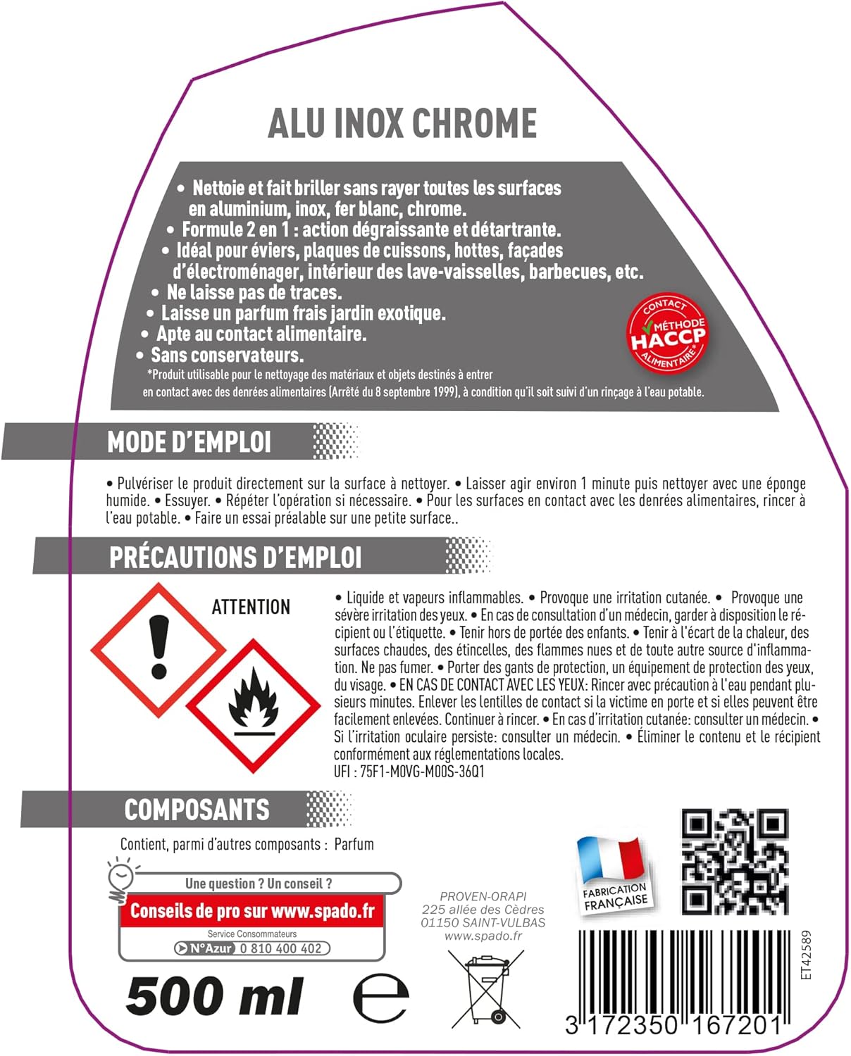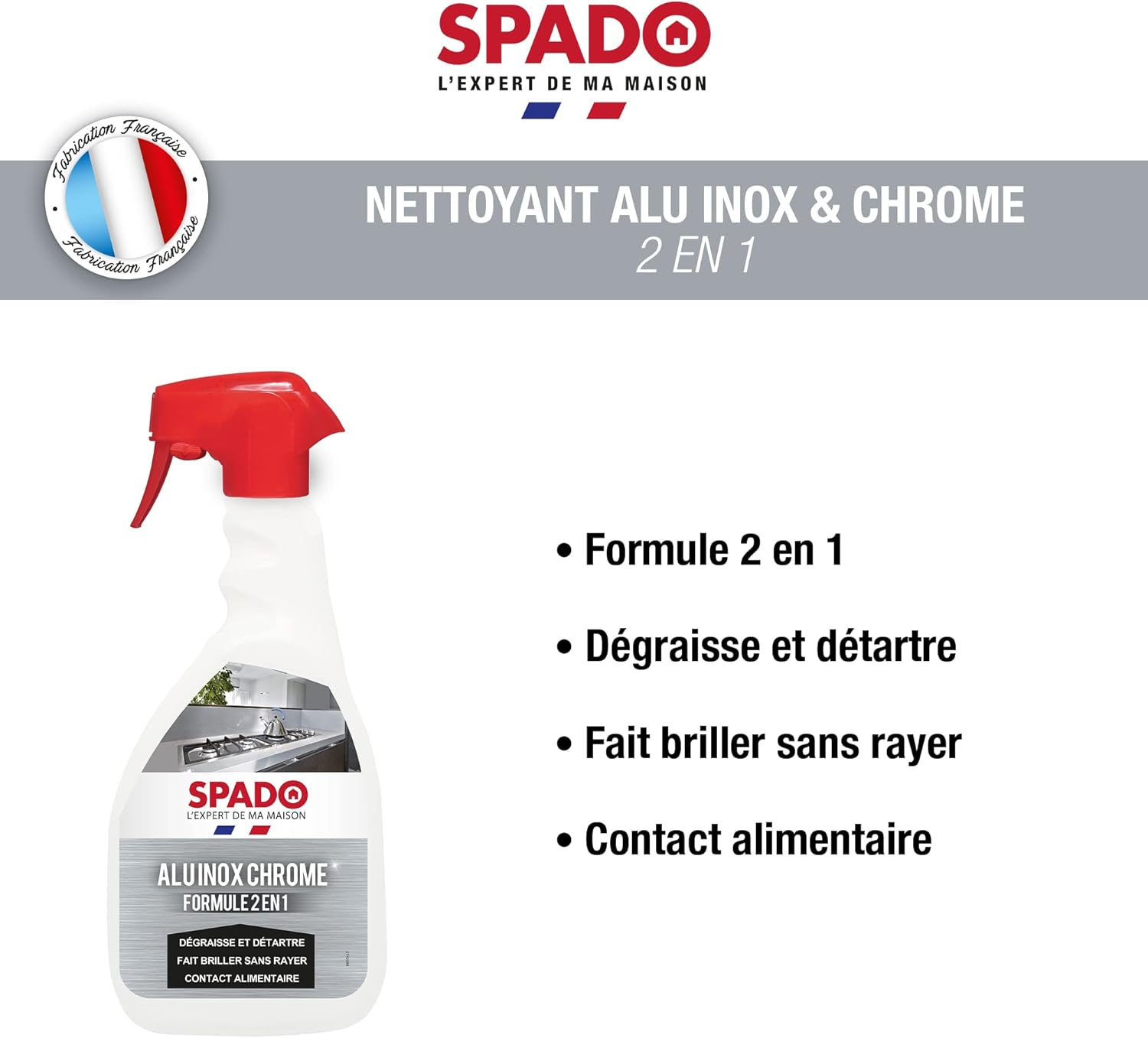Le nettoyant SPADO Alu Inox Chrome nettoie, dégraisse, détartre et fait briller sans rayer toutes les surfaces en aluminium, inox, fer blanc, chrome. Idéal pour éviers, plaques de cuissons, hottes, façades d’électroménager, intérieur des lave-vaisselles, barbecues, etc. Assure une protection longue durée des surfaces, notamment contre les traces de doigts. Ne laisse pas de traces. Laisse un parfum frais jardin exotique. Sans conservateurs. Conforme à la réglementation relative aux produits de nettoyage pouvant se trouver au contact de denrées alimentaires.