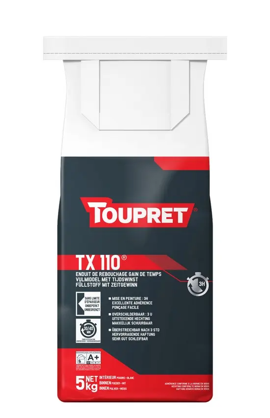Enduit de rebouchage gain de temps en poudre, intérieur, pour application manuelle. TX110® s’applique sur supports neufs ou rénovés, bruts ou peints et est recouvrable par tous types d’enduits, peintures et revêtements muraux. Ne pas recouvrir directement de peinture polyuréthane et époxy en phase solvant.